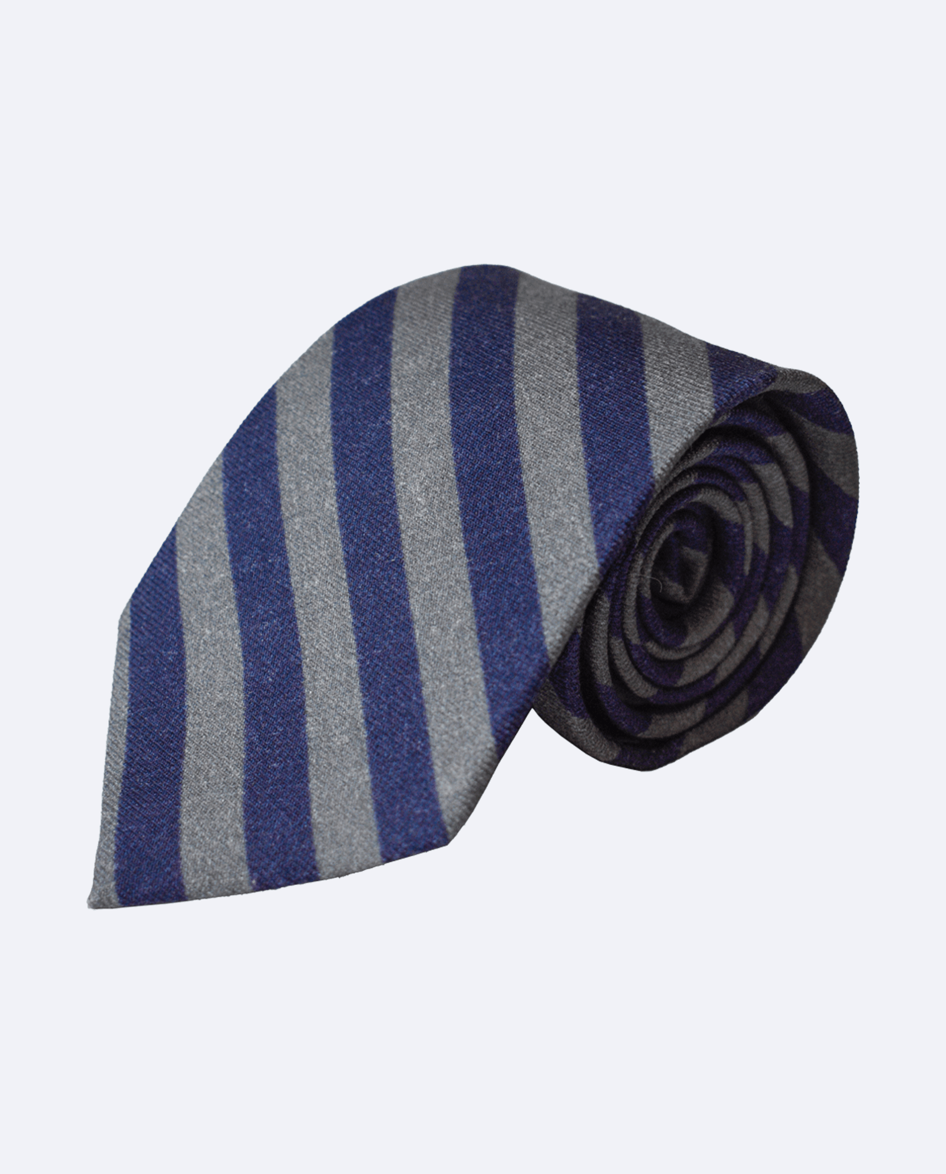 Corbata de rayas en azul marino y gris, pensada para un estilo clásico y equilibrado. Confeccionada en 100% lana italiana, ofrece una textura cálida y un acabado mate que refuerza su carácter elegante.
