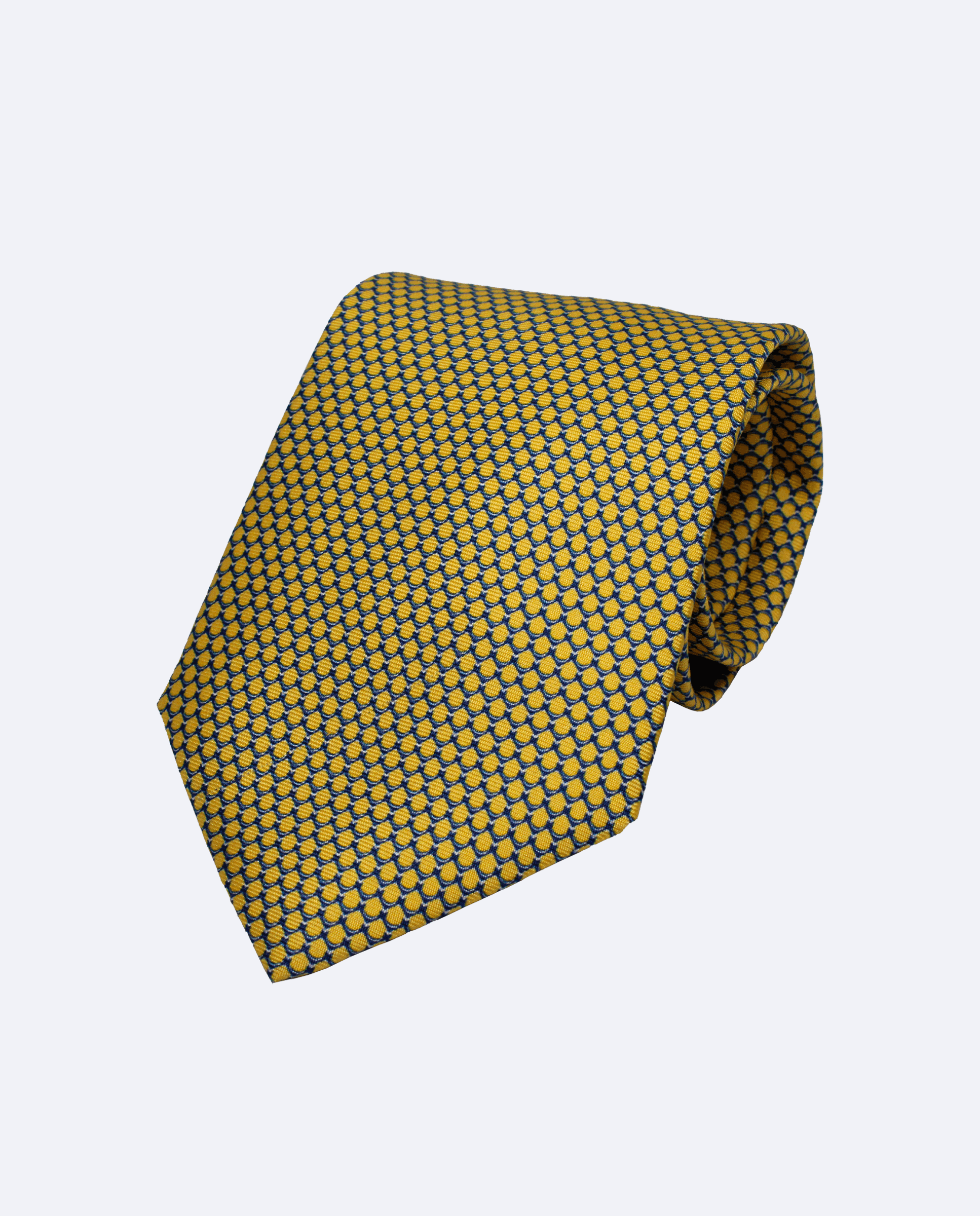 Corbata amarilla con un diseño geométrico en forma de malla que aporta ritmo y profundidad visual. Confeccionada en 100% seda italiana, ofrece una textura ligera y un acabado cuidado.