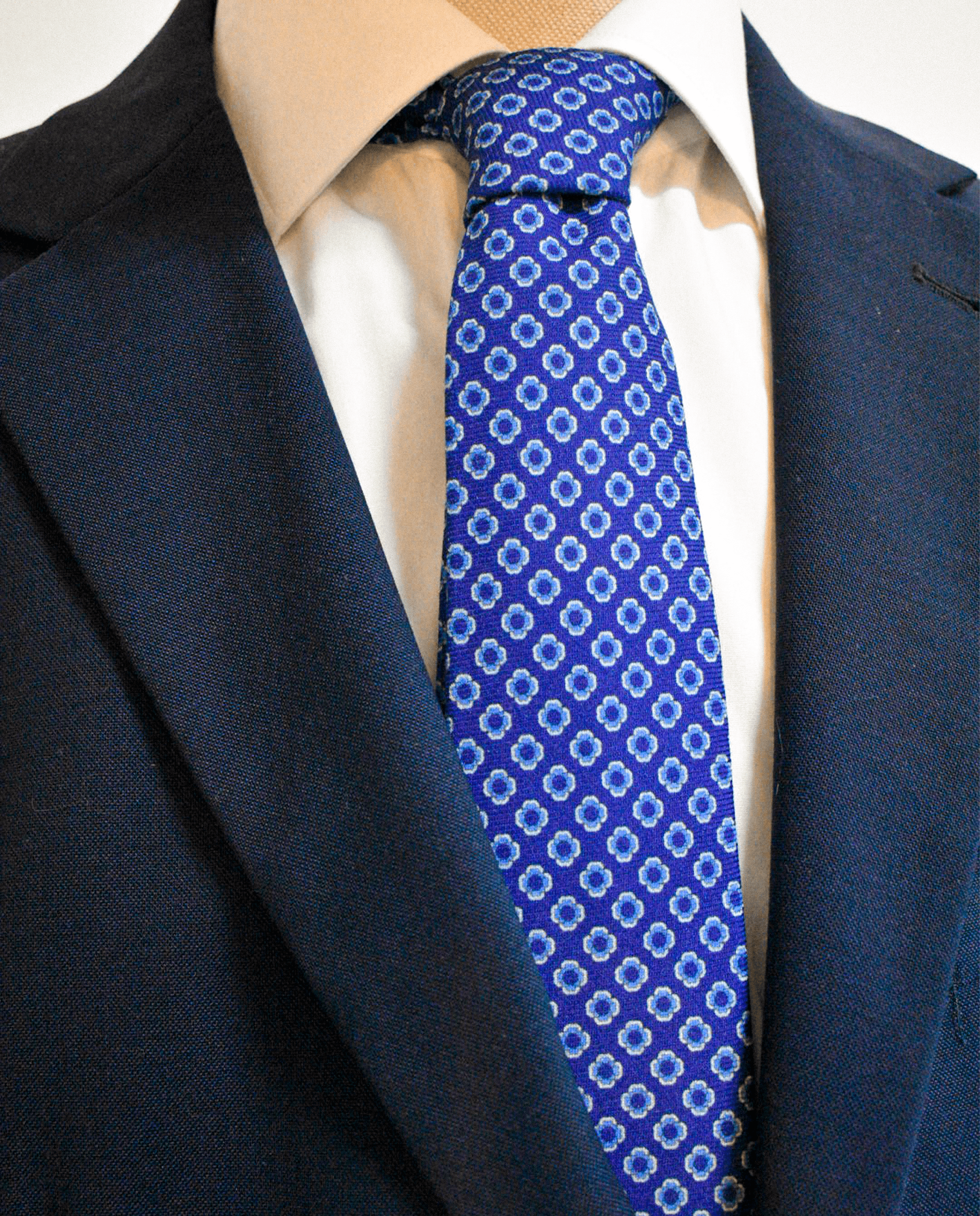 Esta corbata combina un fondo azul profundo con flores de pétalos azul claro, creando un diseño equilibrado y elegante. Confeccionada en seda italiana con mezcla de seda y lana, ofrece una textura rica y una presencia sofisticada.