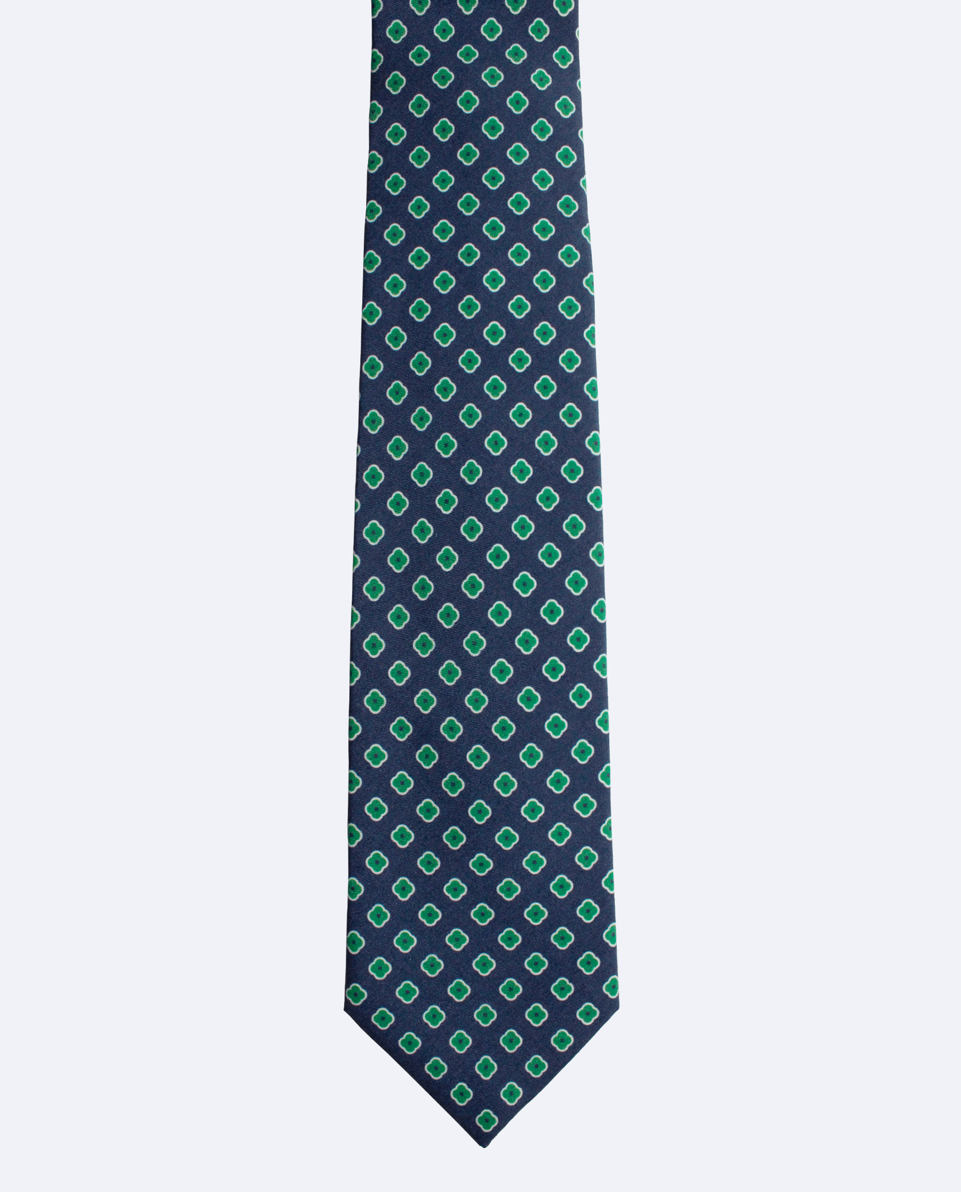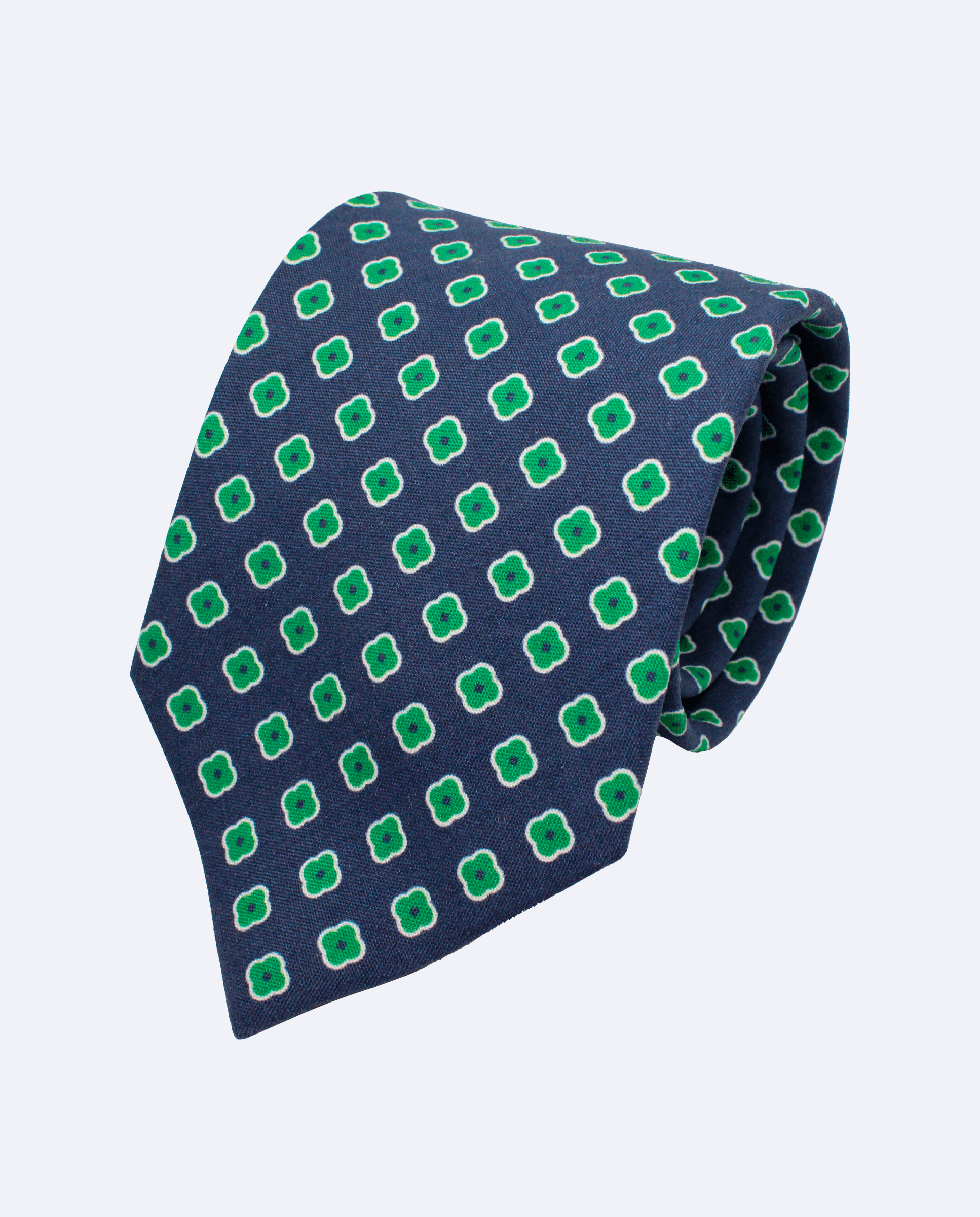 Corbata de seda azul marino con flores verde esmeralda, confeccionada en seda 100% con acabado mate y producida en Italia. Perfecta para ocasiones especiales.