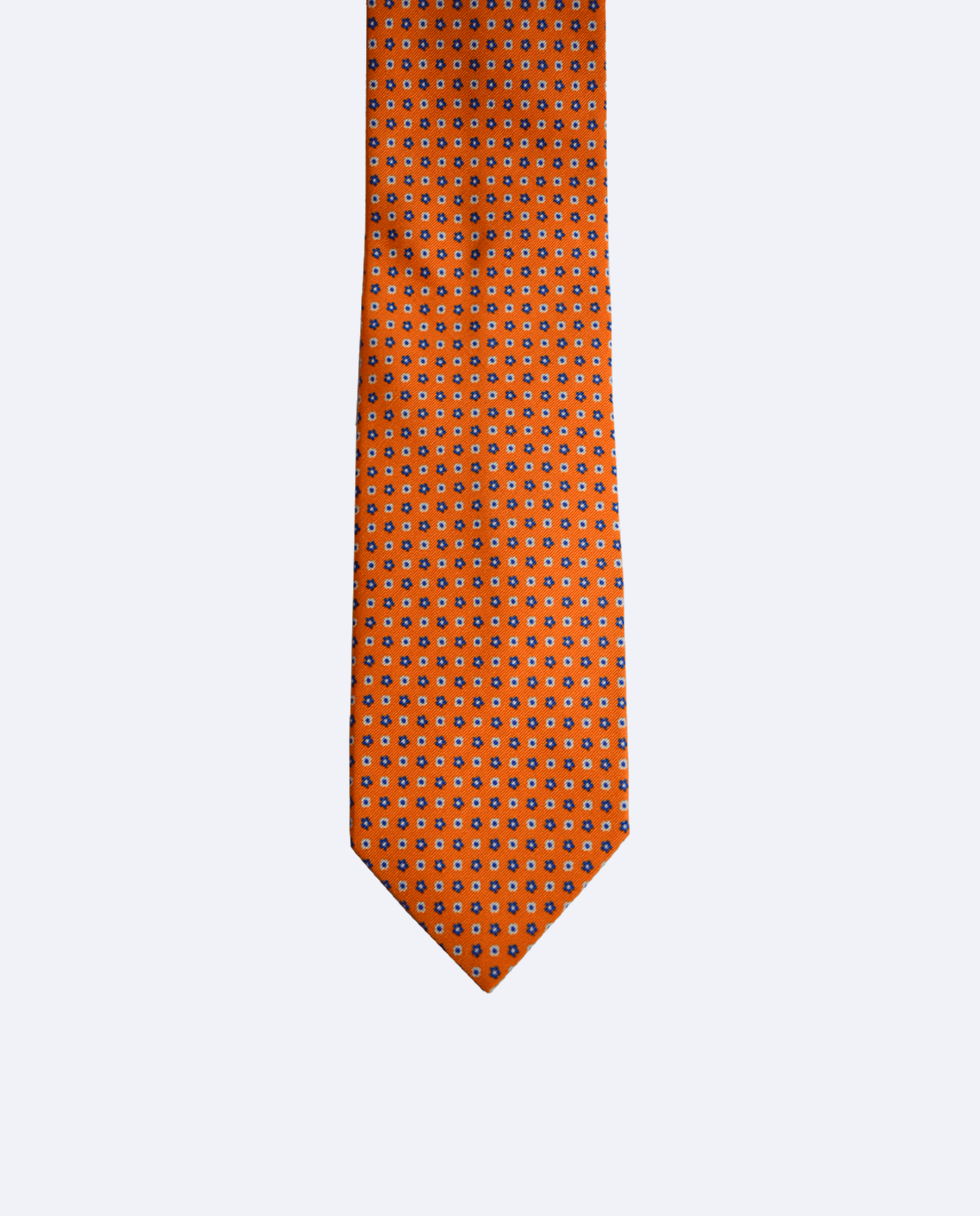 Una corbata con fuerte personalidad, de color naranja en tejido de sarga y un elegante diseño floral que alterna pétalos azul marino y blancos. Confeccionada en 100% seda tejida en Como, Italia, ofrece una textura fluida y un acabado refinado.