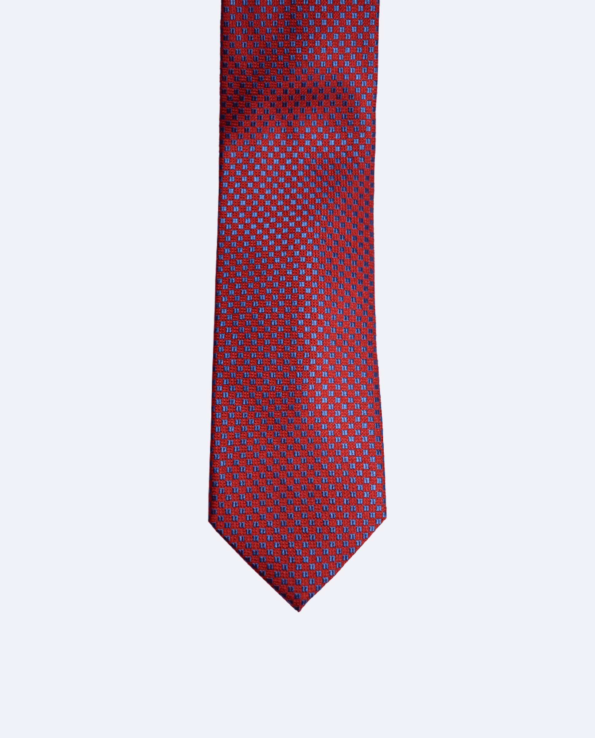 Corbata de fondo rojo con pequeños cuadros en azul marino que aportan contraste y dinamismo, acompañados de un ligero brillo que realza el tejido. Confeccionada en seda jacquard en Como, Italia, ofrece una caída fluida y un acabado cuidado.