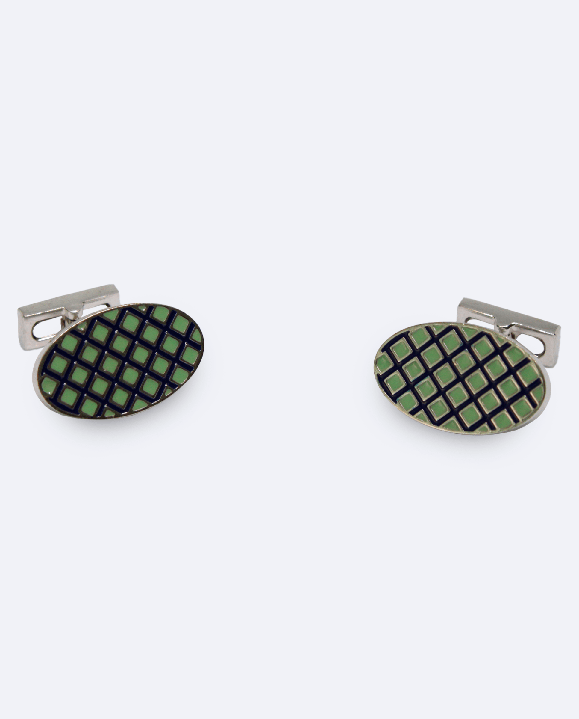 Gemelos ovalados rombos verde claro con un diseño esmaltado que combina una base azul marino y rombos en un tono verde suave. Hechos en metal acabado en rodio.