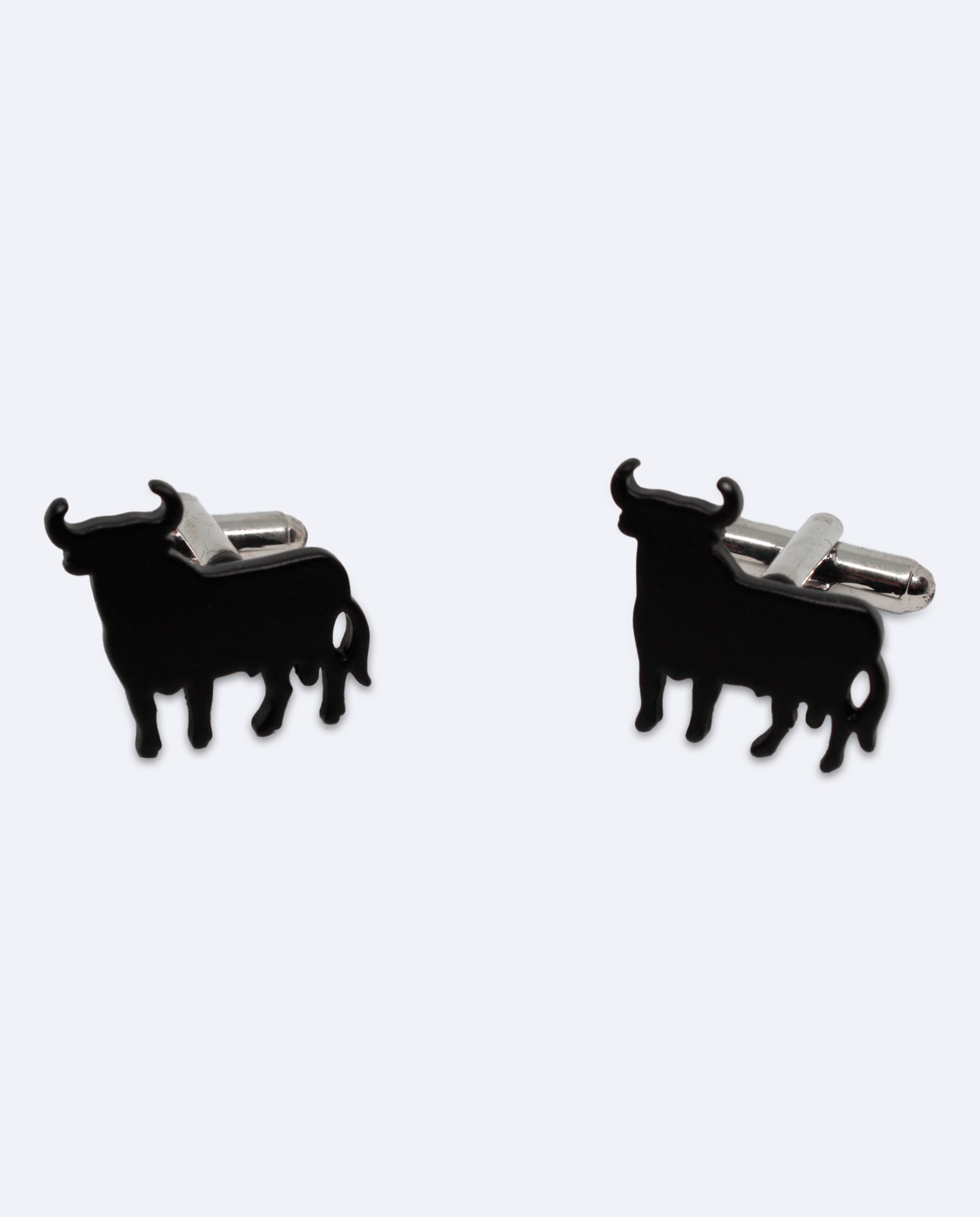 Gemelos toro negro con un diseño definido y esmaltado que representa la silueta de un toro en acabado brillante. Fabricados en metal con acabado en rodio.