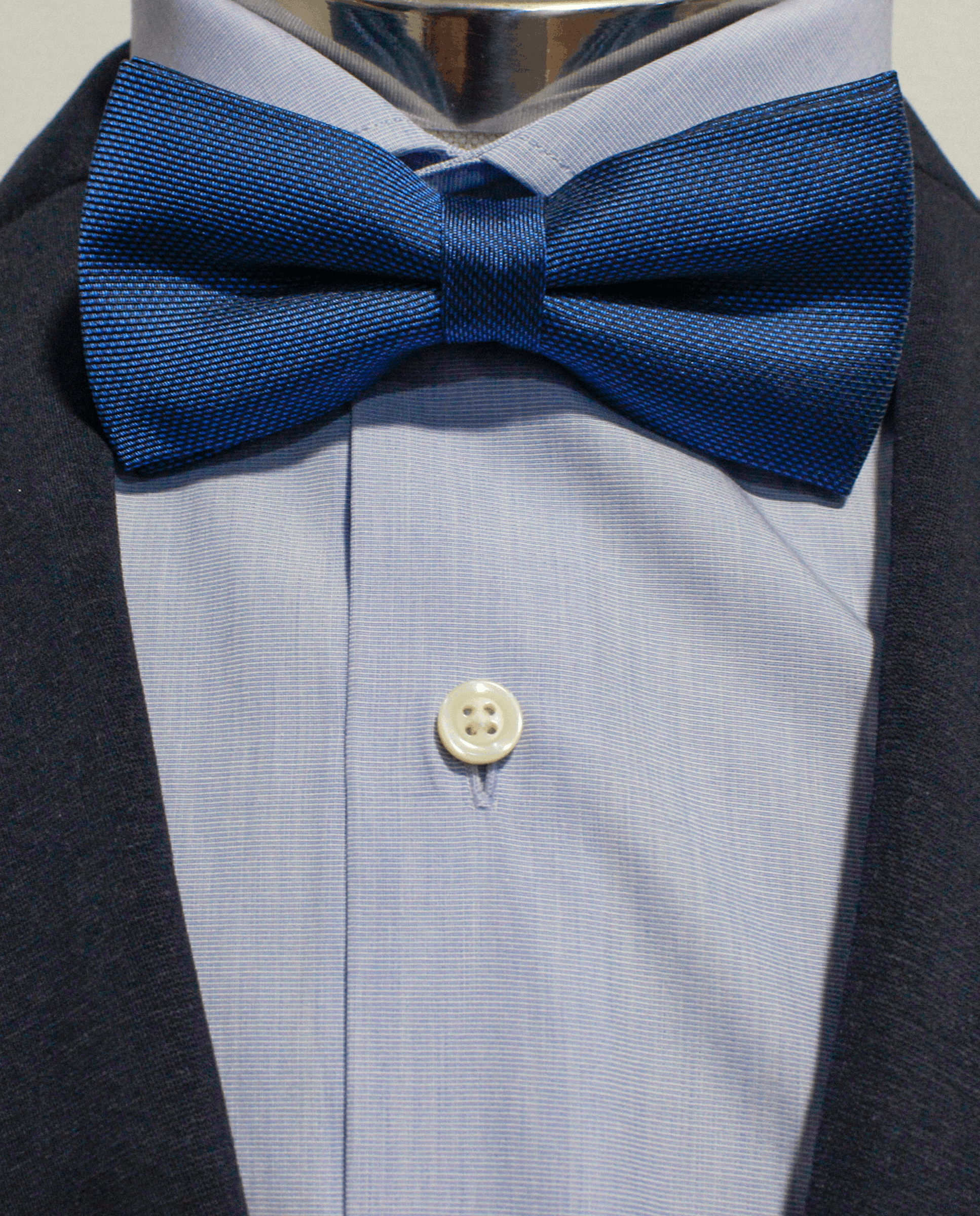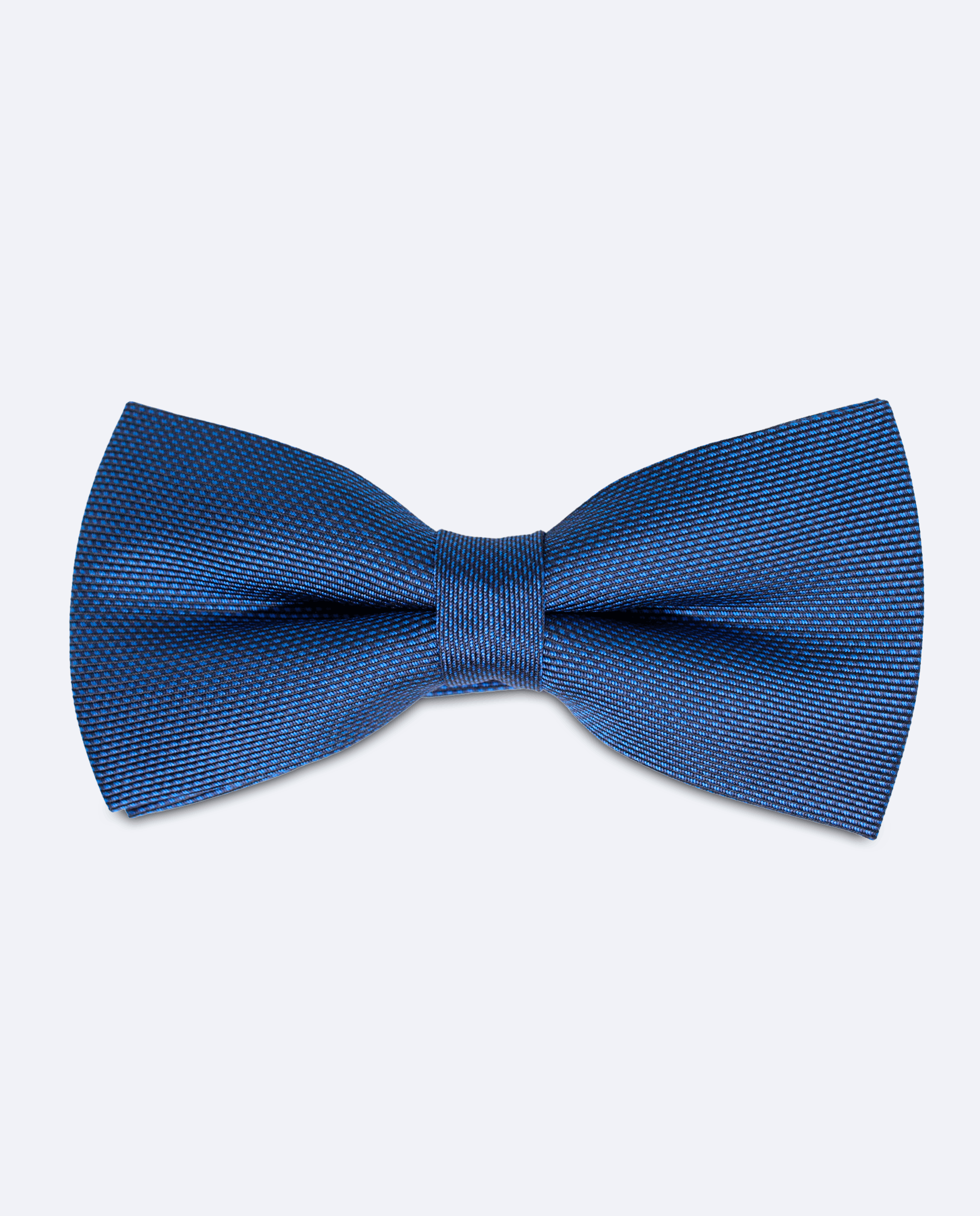 Pajarita azul marino con diseño de micropuntos, confeccionada en 100% seda jacquard. El patrón combina una línea horizontal negra con una sutil alternancia de micropuntos en negro y azul marino, creando un efecto visual equilibrado y con profundidad. El tejido, importado de Como, Italia, destaca por la riqueza del dibujo y la calidad del acabado.