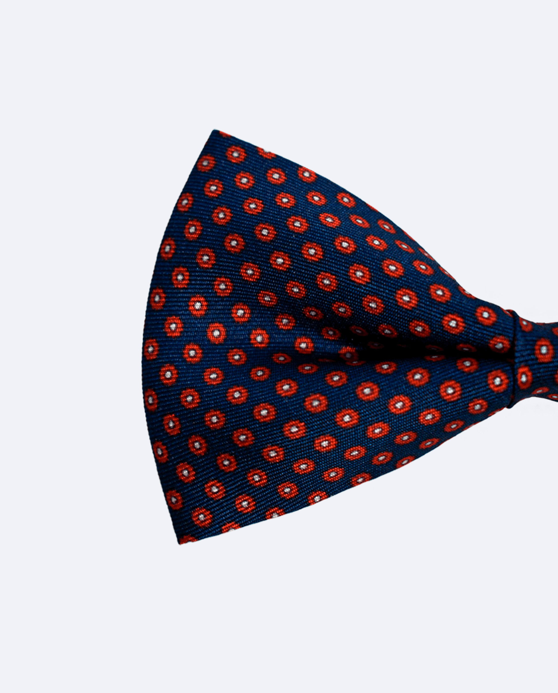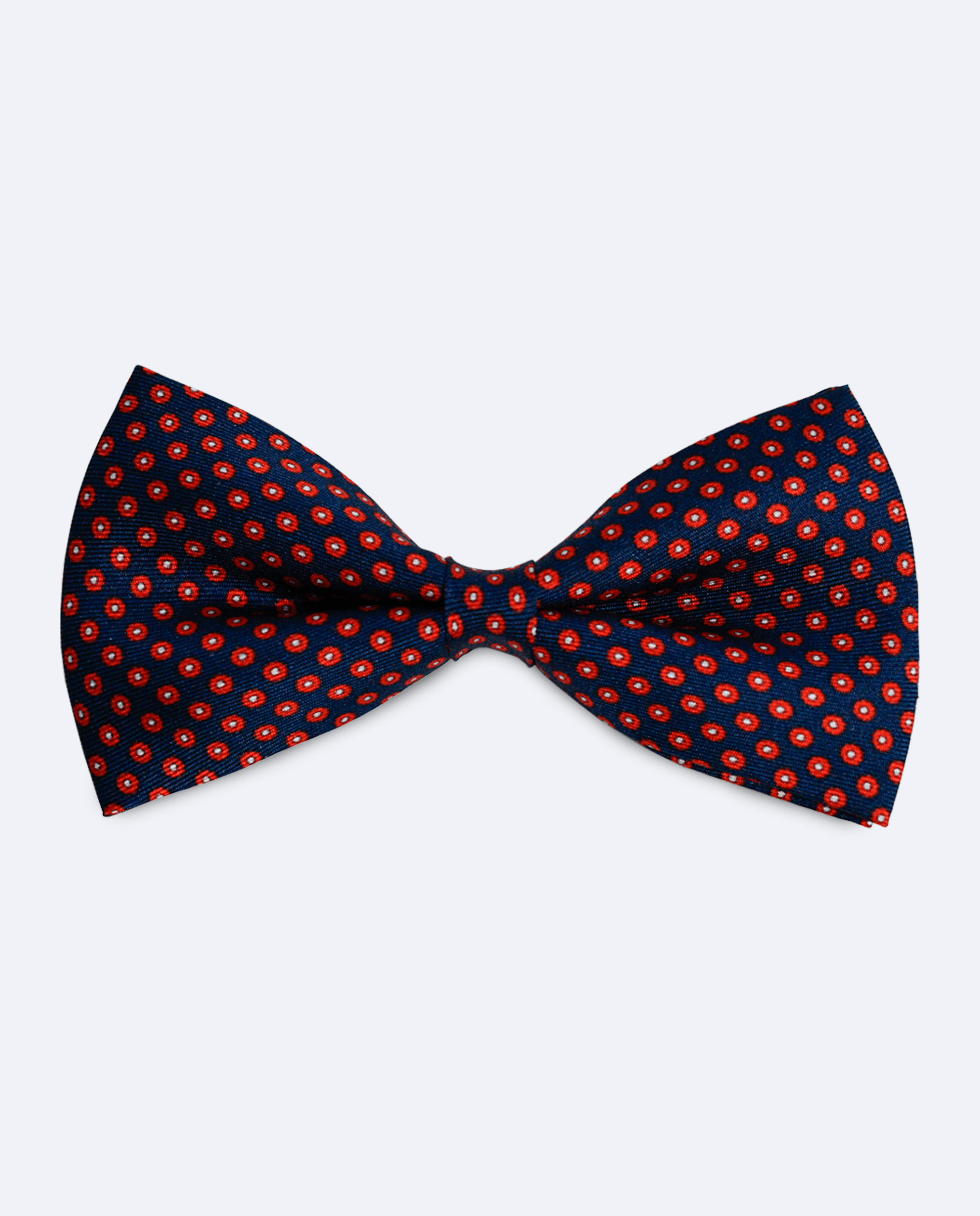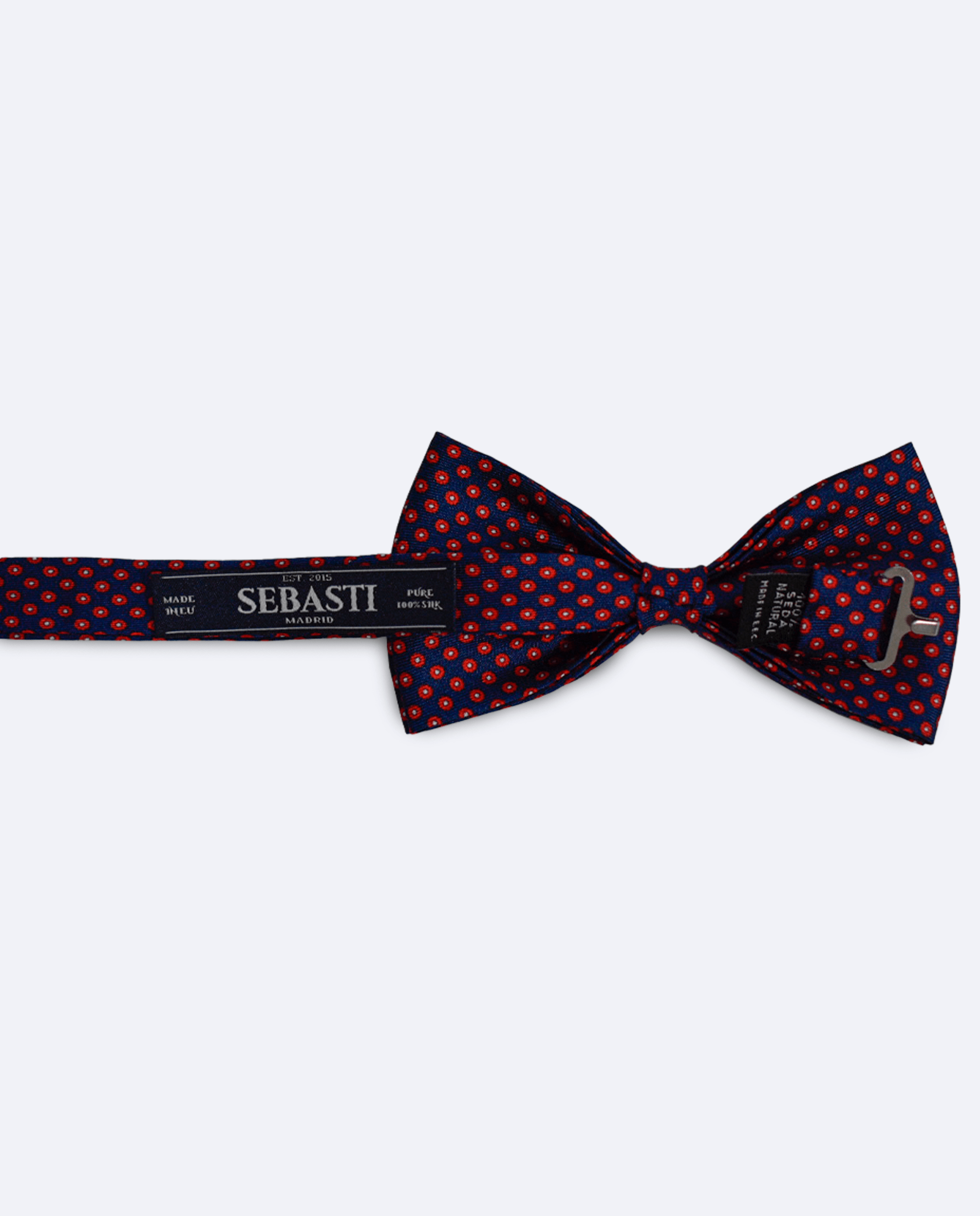 Fabricada en seda de alta calidad, esta pajarita azul marino con diseño rojo floral te sorprenderá. Hecha artesanalmente para ti, disponible solo en Sebasti.