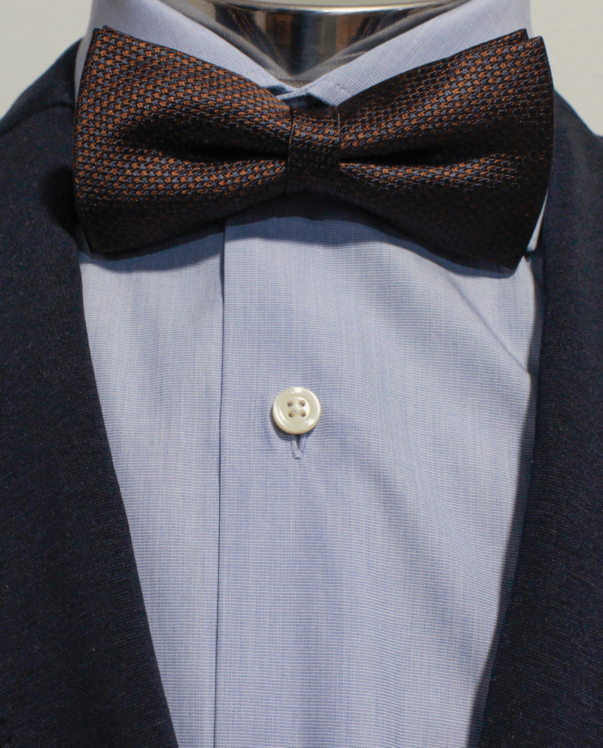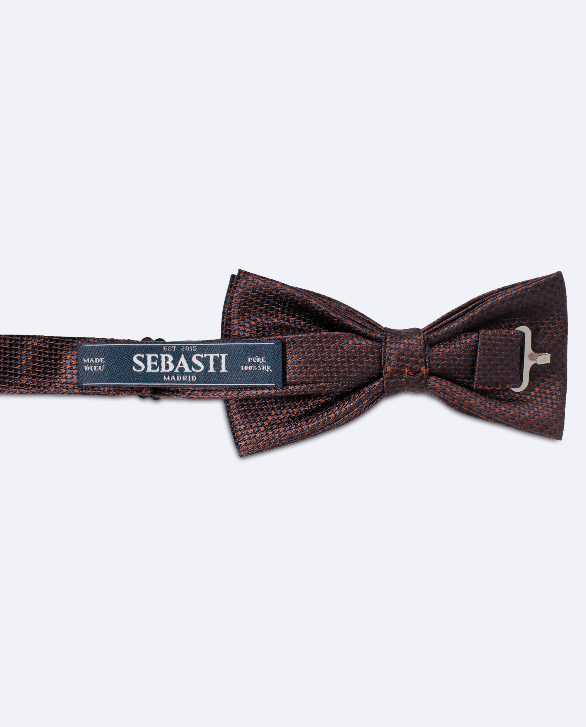 Pajarita marrón y azul marino con microdiseño de rombos, confeccionada en 100% seda italiana jacquard con acabado mate satinado. El patrón intercala ambos colores en un diseño horizontal que aporta textura y profundidad visual, manteniendo un equilibrio elegante y fácil de combinar.