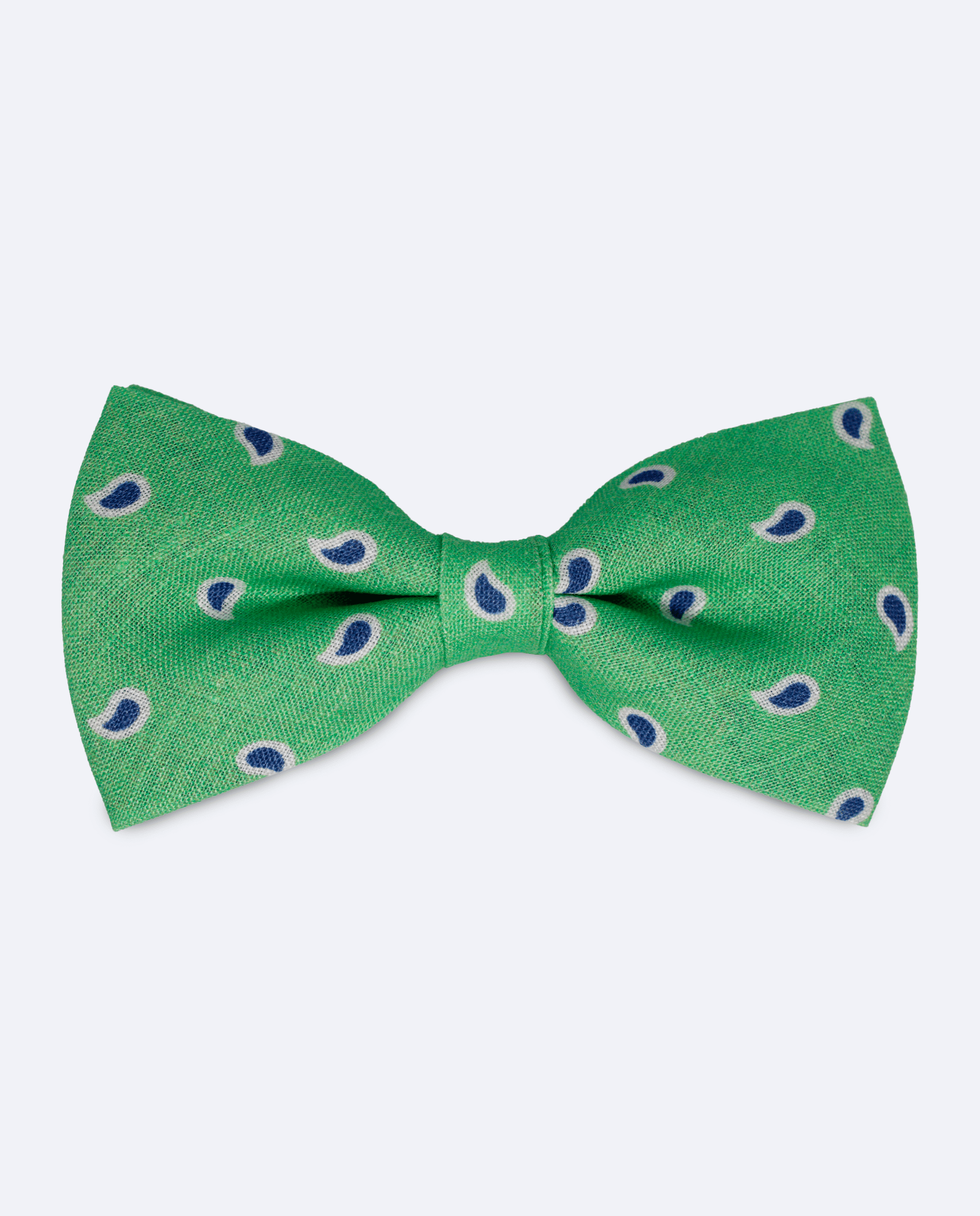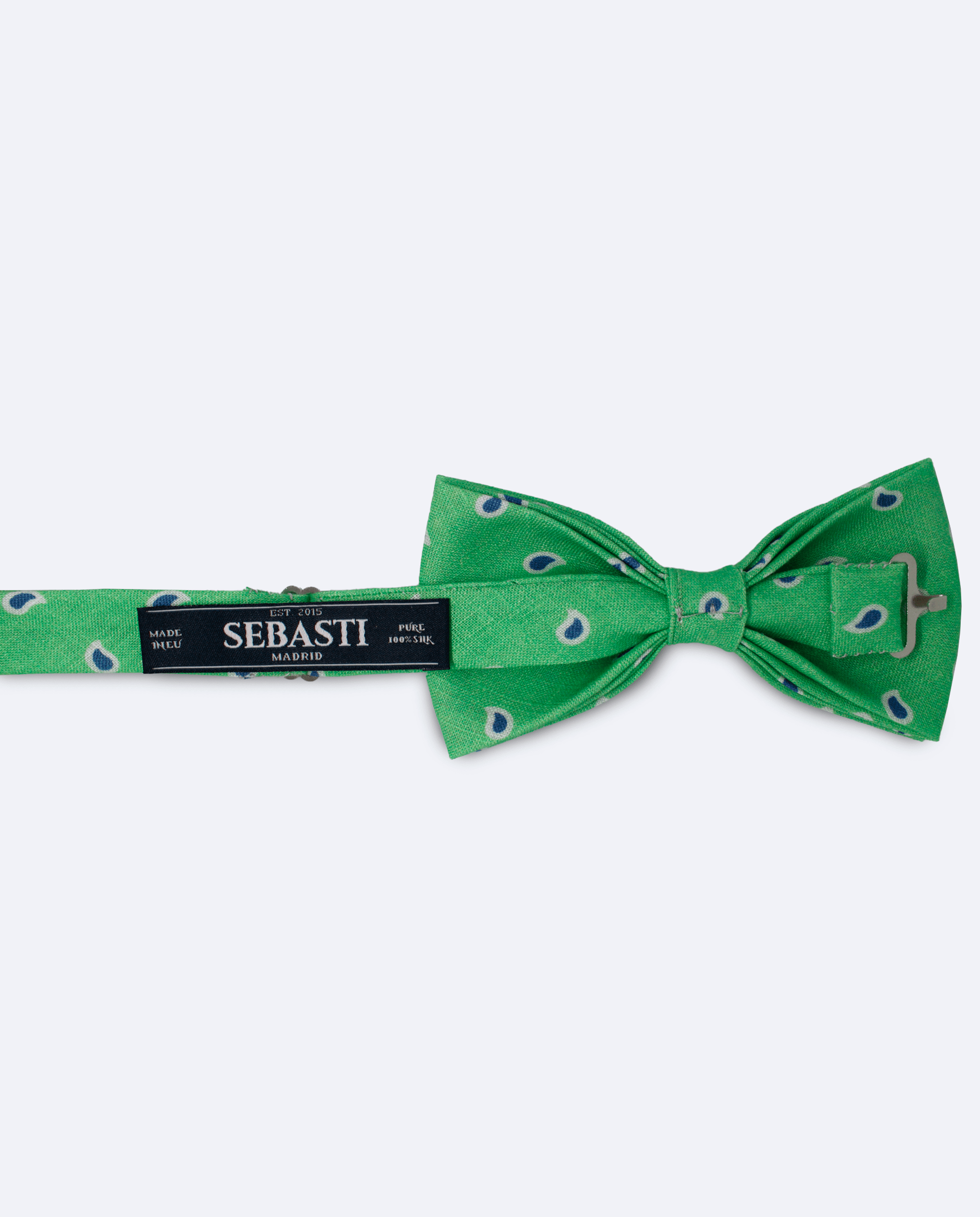 Pajarita verde lima con diseño paisley azul. Ligera y con estilo, ideal para bodas y eventos al aire libre. Hecha a mano en lino con amor.
