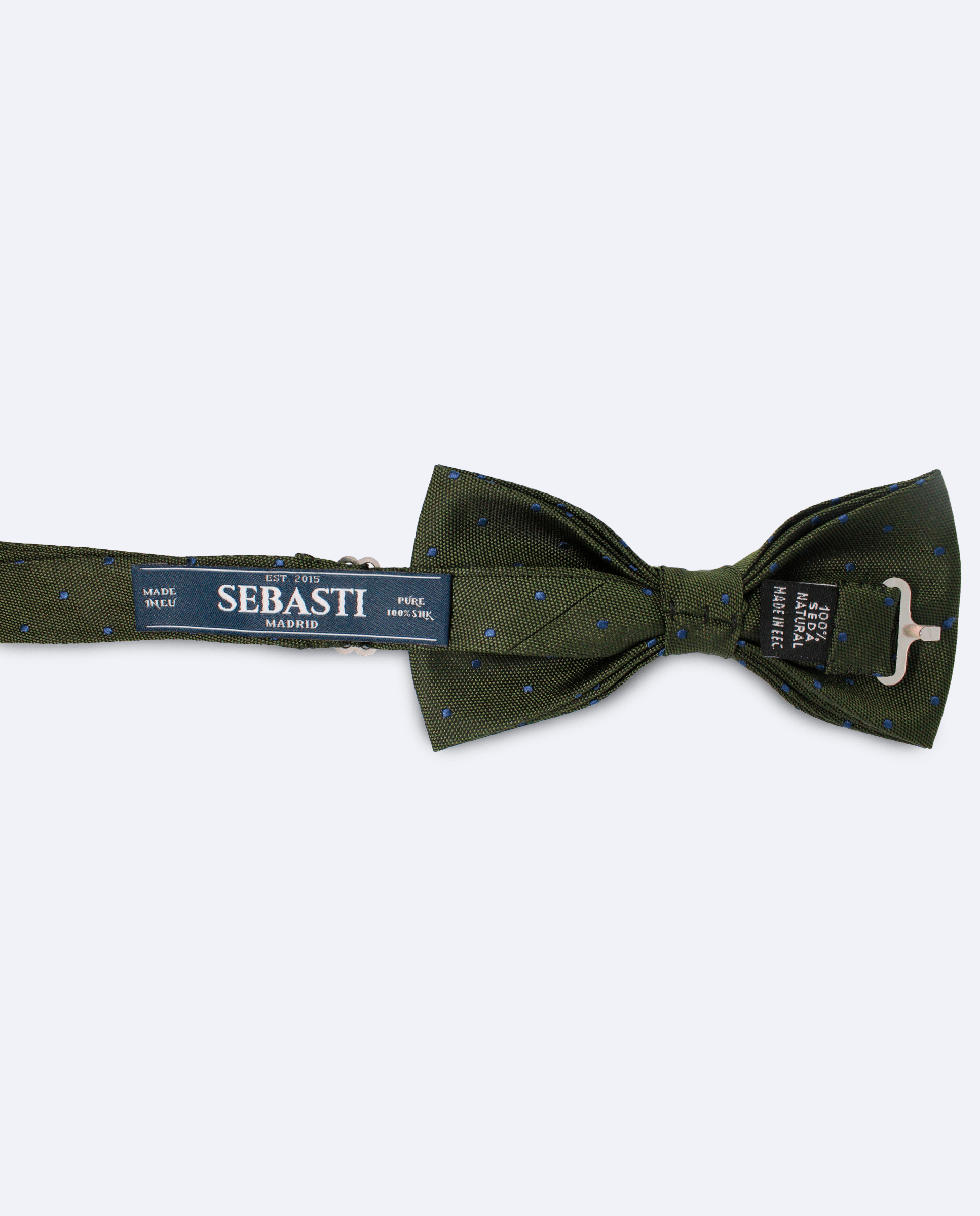 Pajarita verde oliva oscuro de seda con lunares azul marino, un diseño elegante y con carácter. El fondo profundo en verde oliva se combina con lunares ligeramente brillantes en azul marino, creando un contraste refinado y lleno de estilo. Confeccionada en 100% seda italiana tinto in filo, trabajada con el sistema jacquard, ofrece textura y un acabado artesanal de alta calidad.